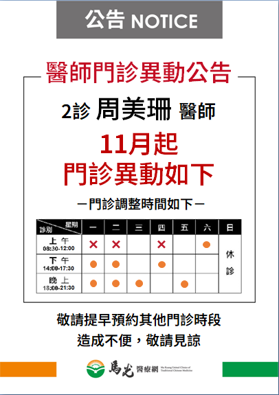 【屏東院】周美珊醫師11月起門診異動如下,欲看診可提早或往後預約 !